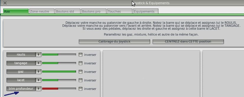 Une fois X-plane lancé classiquement, l'onglet "Axe" de son menu "Joystick et équipements" fait apparaître un nouvel axe qui reste à configurer